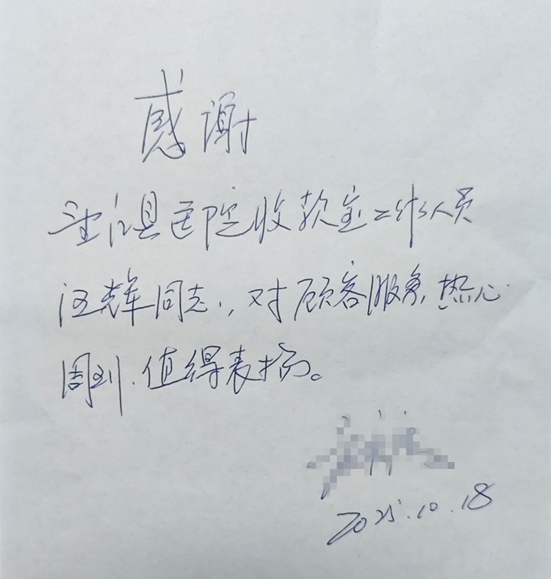 “现在这样热心又周到的年轻人不多了,他的服务态度真的好,给我们患者省了不少麻烦!”10月18日,县医院收款室汪辉因主动为来院开药的夏叔叔排忧解难,收到了夏叔叔手写的感谢信,字里行间满是赞许。